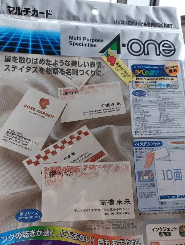 名刺ぐらい自分で印刷しようと、最初はマイクロソフトのWordにある差し込み機能というものをつかって、ラベル印刷でA4のマルチカード紙に印刷をしていました。