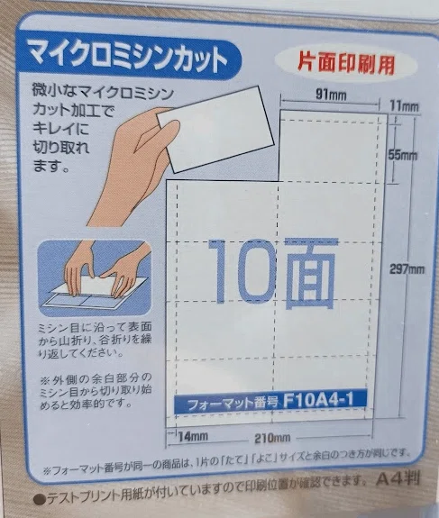 買ってきたマルチカードのパッケージを見ると、1つの名刺サイズは91mm✖️55mmとありますので、