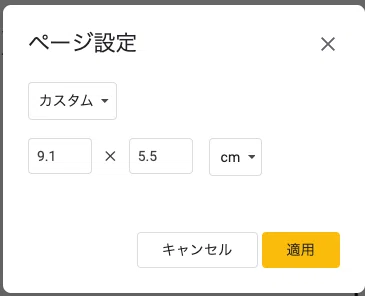 スライドのページ設定を9.1cm✖️5.5cmに設定します。