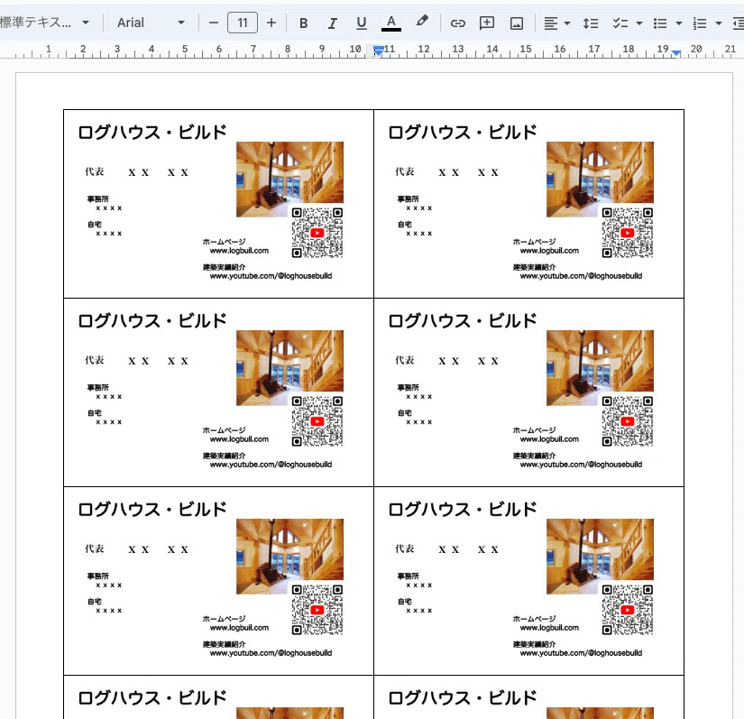 A4のマルチカードに印刷するため、Googleドキュメントで名刺コンテンツ10枚分をレイアウトしていきます。