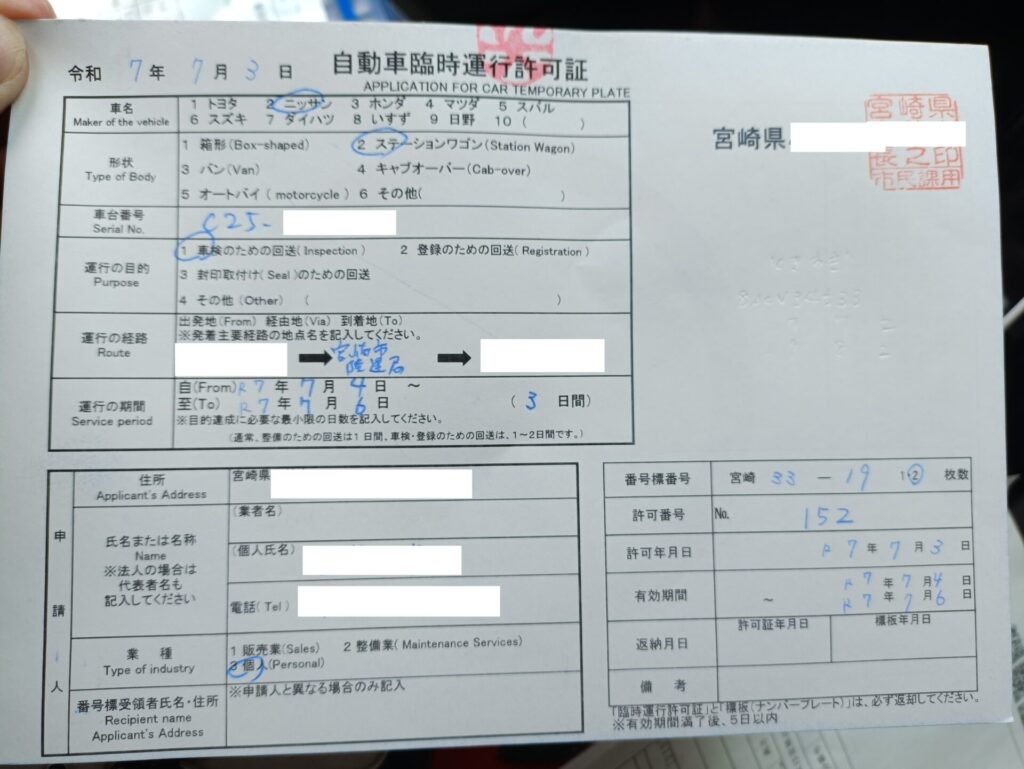 しばらくすると、仮ナンバー2枚と自動車臨時運行許可証を借りられました。