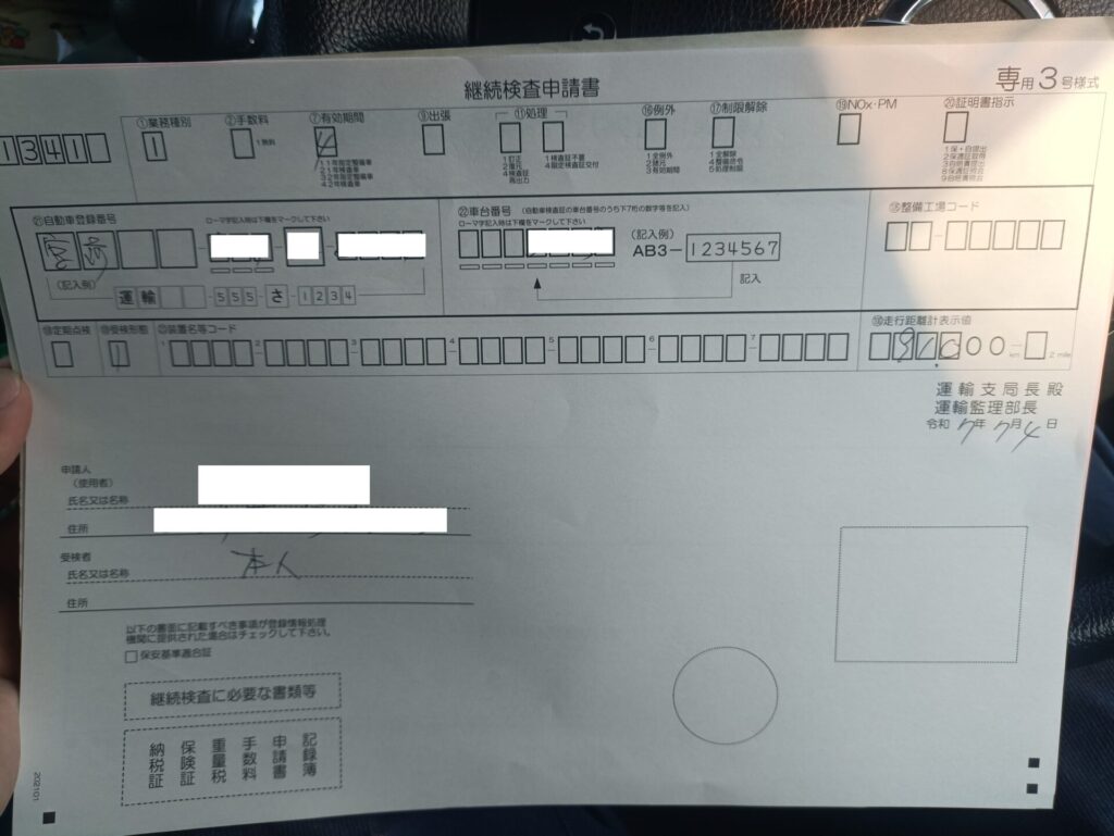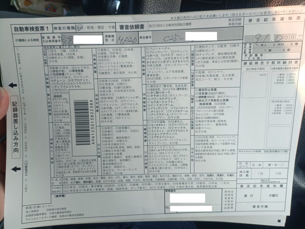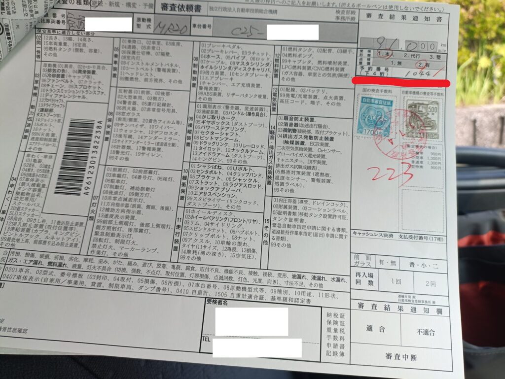 わたしはここで自動車検査票の右上部分に予約番号(下4桁)を記入しました。